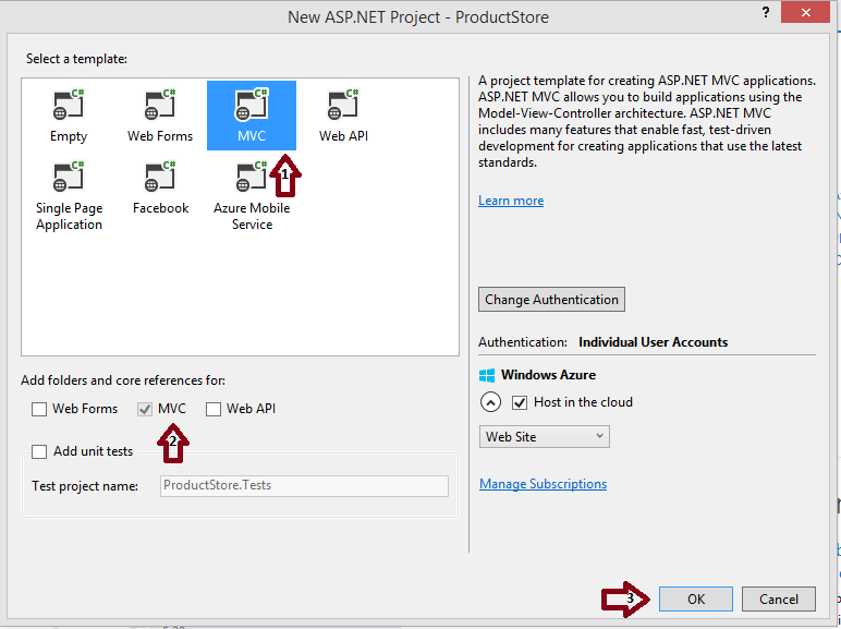 Select MVC template and click on OK.