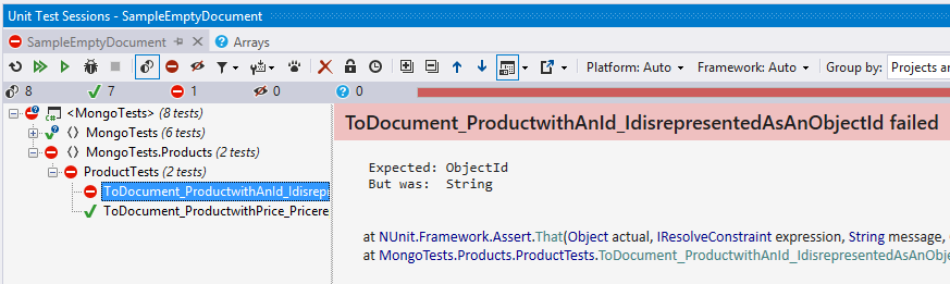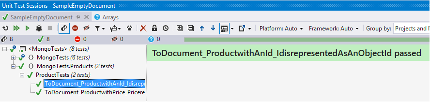 To test here we have inherited it from the Assertion helper and created a variable named document and set the result to BsonDocument on our product and an assertion for our resulting document.