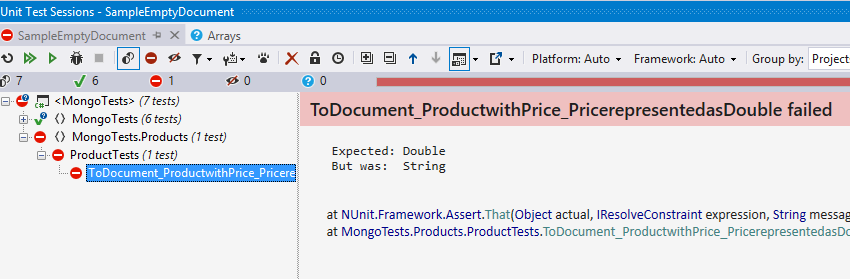 As expected the test fails. To get this to pass we must decorate our Price property with the BSON Representation attribute and specify the BSON type for double, as shown.