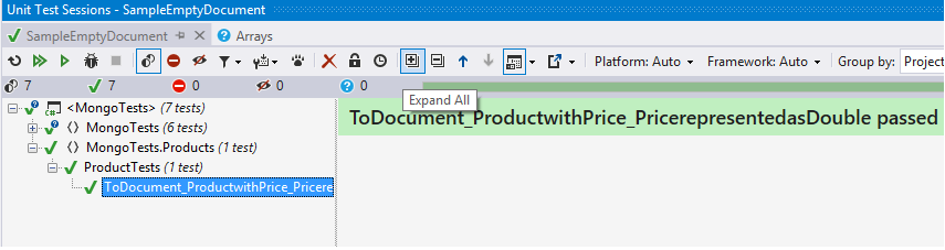 Create a folder named Products inside our MongoTests Project and add a class named ProductTests and create a test as shown: