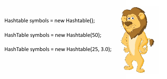A Hashtable object can be instantiated in one of the following three ways (actually there are several more, including various types of copy constructors, but we will remain with the three most common constructors here).