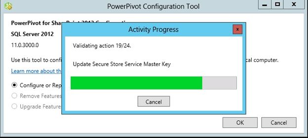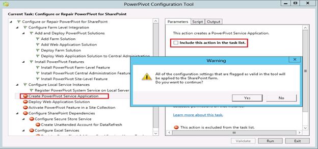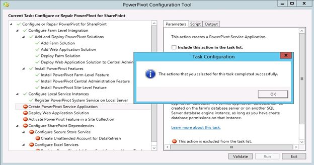 Select the "Create PowerPivote Service Application "and uncheck the "Include this action in the Task List".