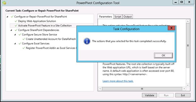 Now again we need to run the PowerPivot Configuration tool and select the Activate Powerpivot Feature in a Site Collection and select the site URL in the right side. Click on the Validate button, after the validation click on Run.