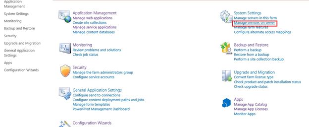 Open the Central Administration then select System Setting => Manage Services on Server.