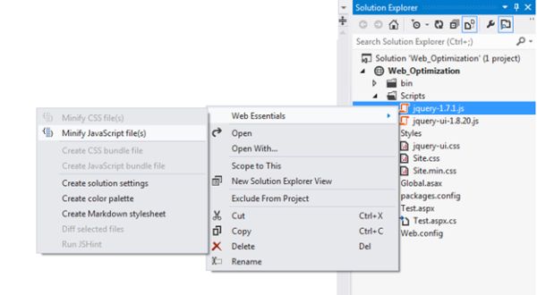 - Right-click on whichever js file you want to minify. Here I clicked on jquery-1.7.1.js. You will get the option “Web Essentials”