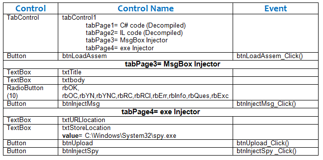 As we stated in the earlier articles, this software contains several form controls over the end-user interface. So, it is worthless to discuss the implementations of entire controls, rather we shall move ahead with the control that are currently consumed in these articles. Here is the list of Windows Forms controls for the design and implementation of a message box and spyware injection.