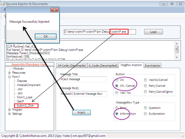 The functionality of External Message Box and spyware injection into a binary into the software is quite a long process and exhaustive. We shall need to play bizarre classes and methods in order to place the external MSIL code into an existing binary.