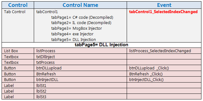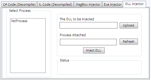 The Listbox control basically enumerates all the running machine processes to ease the selection of the attaching process (victim) during DLL injection. The first text box gathers the inject DLL full path via upload button and the second TextBox displays the selected process from the list box. The Refresh button refreshes the list box if some service is newly begun or terminated. Finally the Inject DLL button injects the DLL into the selected process. Once all the previous form controls are placed and arranged in the tabcontrol the design looks something like the following: