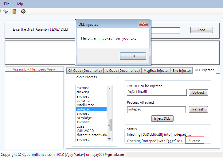 Open the Spyware Injector and Decompiler software after compiling it successfully and go to the DLL injection tab. Here, we found all the running machine processes in the List box control. The moment we select any, for example Notepad, it is placed in the corresponding Process TextBox and becomes the victim process. Finally, after hitting the Inject DLL button, DLLlib.dll is injected into the Notepad process as in the following: