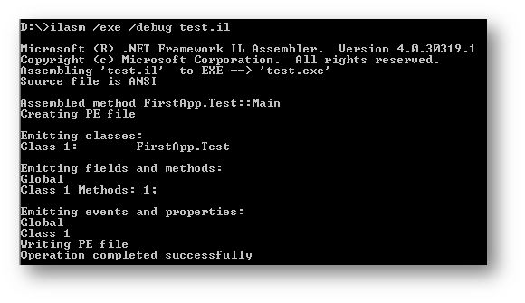 After finishing the code, save this file as Test.il and compile it using the .NET Framework tool ILASM.exe shipped with the .NET Framework as in the following command: