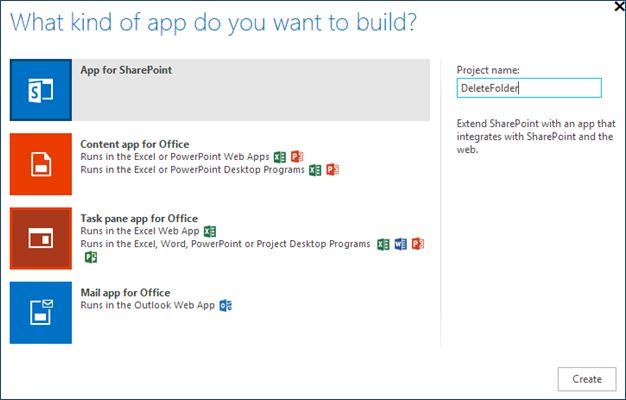 - Select App for SharePoint, enter the Project name and then click on Create.