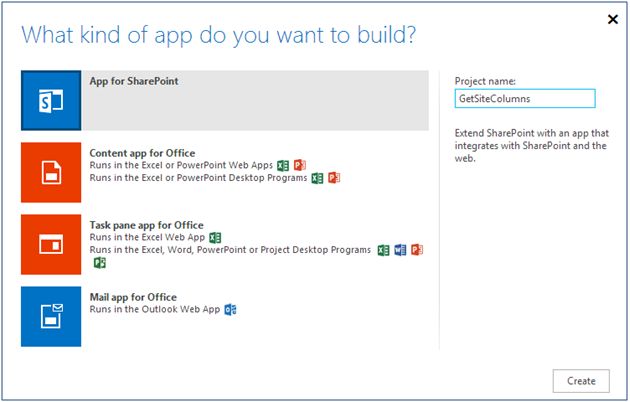 - Select App for SharePoint, enter the Project name and then click on Create.
