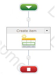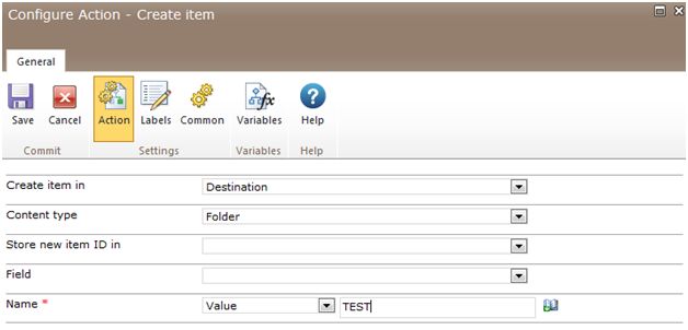 The Create item action creates a new folder in a SharePoint 2010 Document Library.