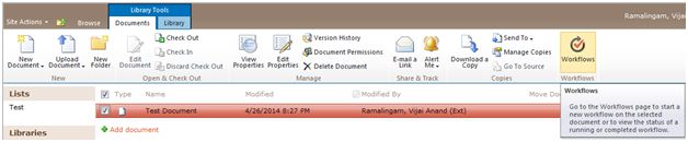 - Select the document and then click on Workflows in the ribbon interface.