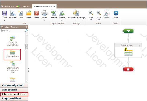 - Drag and drop the Create item action from the Libraries and lists section.