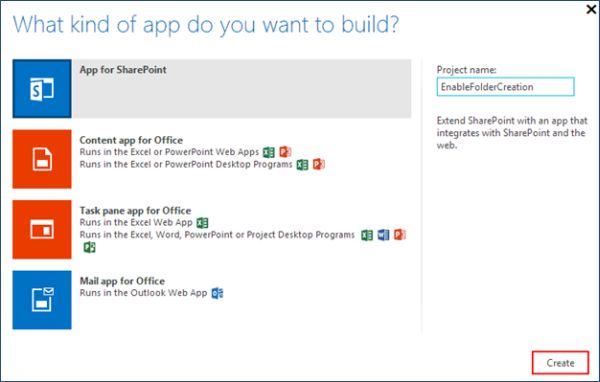 - Select App for SharePoint, enter the Project name and then click on Create.