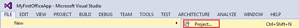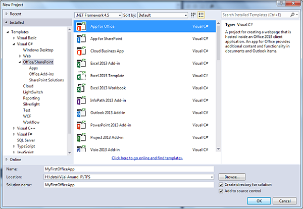 - Select “App for Office” from the installed templates, enter a name for the app and then click on the Ok button.
