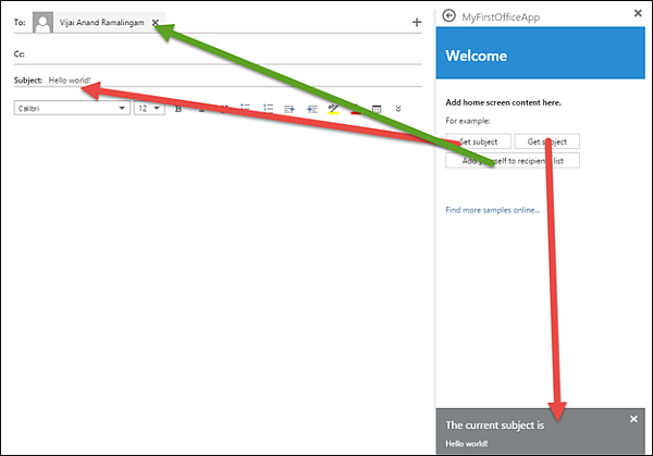 - Click on the “MyFirstOfficeApp” app. The HTML is rendered as shown below.