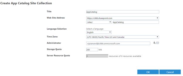 - Specify all the details on the Create App Catalog Site Collection page as shown below. Click on the Ok button.