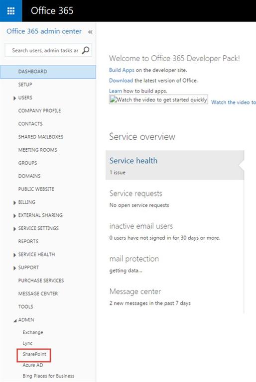 - In the left navigation task pane, expand Admin and then click on the SharePoint link.