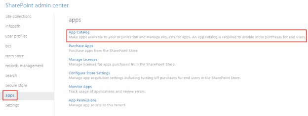 - In the left navigation task pane, click on the apps link. Click on the App Catalog link.
