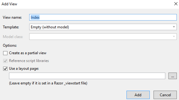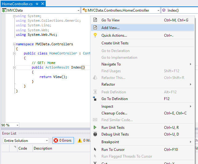 Now, Add View for the 'HomeController', for that right click on Action Method Index and click on 'Add View'.
