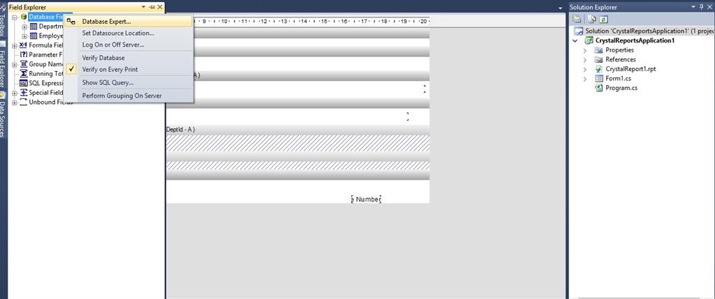 Step 2: Now open the Crystal Report, go to Field Explorer, right click and select Database expert like the following screen: