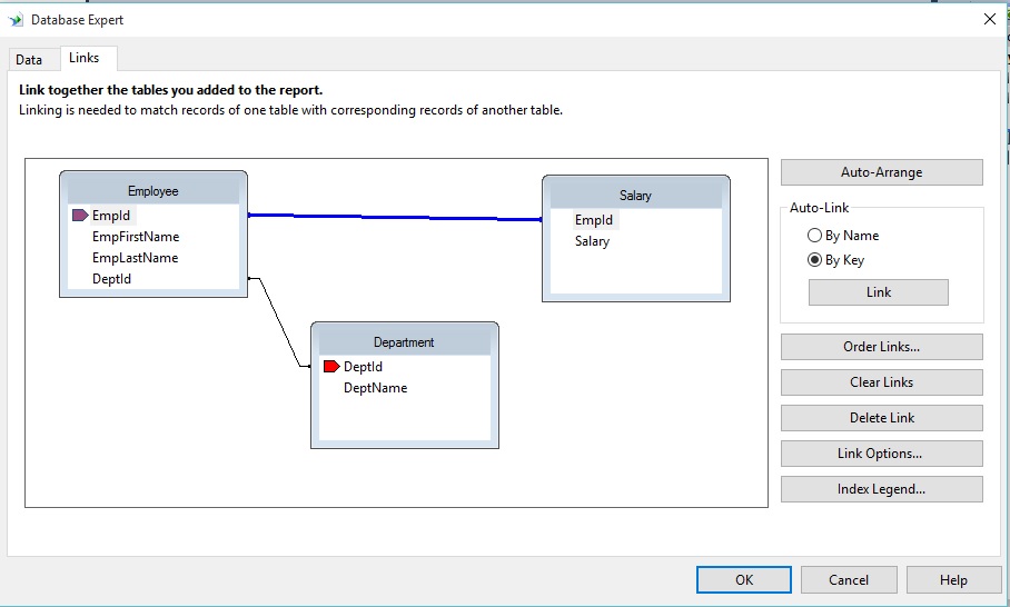 Step 4: Now we have Salary table. Go to Links tab, give a link to Employee table and Salary table on EmpId field like the following screenshot.