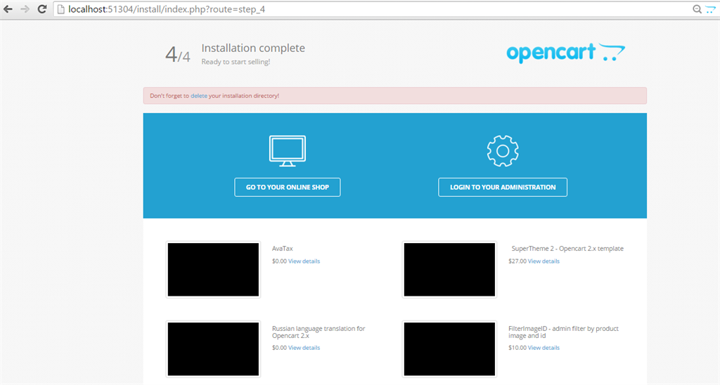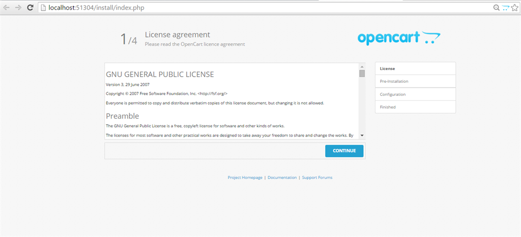 Once you click 'Ok' it will run the opencart setup wizard according to the following screen. Click on 'CONTINUE' on License Agreement page.