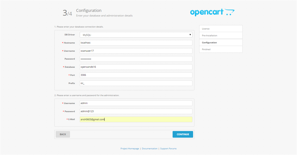 Next step you have to enter your Server, Database and admin (Opencart) details in the configuration section according to the following screenshot,