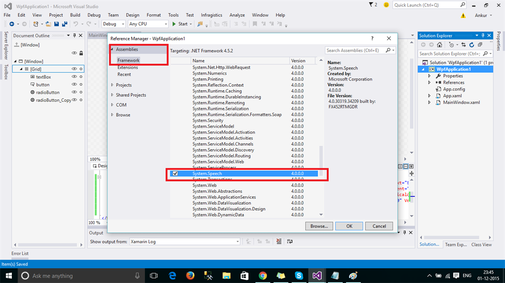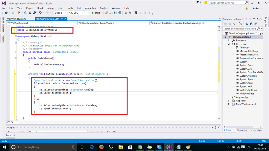 Step 4: Add the Namespace: System.Speech.Synthesis in your .cs file and add code on button click event as per the following screen,