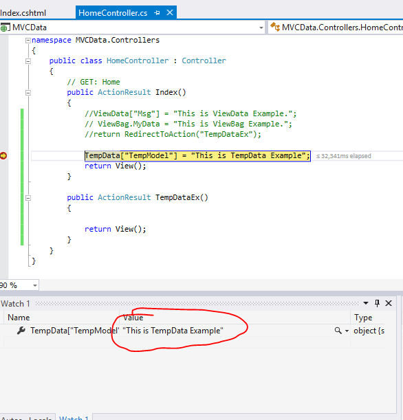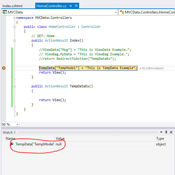 We will continue from the previous article; let us Set TempData["TempModel"] = "This is TempData Example"; in HomeController.