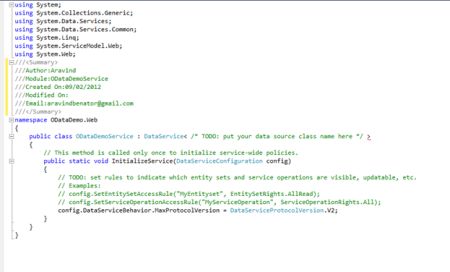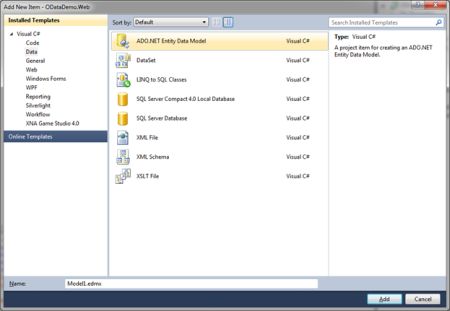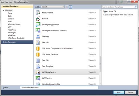 Step 4 : Add a WCF Data service to the web application. Here, I have named it "OdataDemoService".