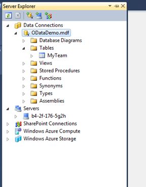 Step 2 : Add one local db to the OdataDemo.Web application. I have created an OdataDemo database with a table called MyTeam as shown in the following screen.