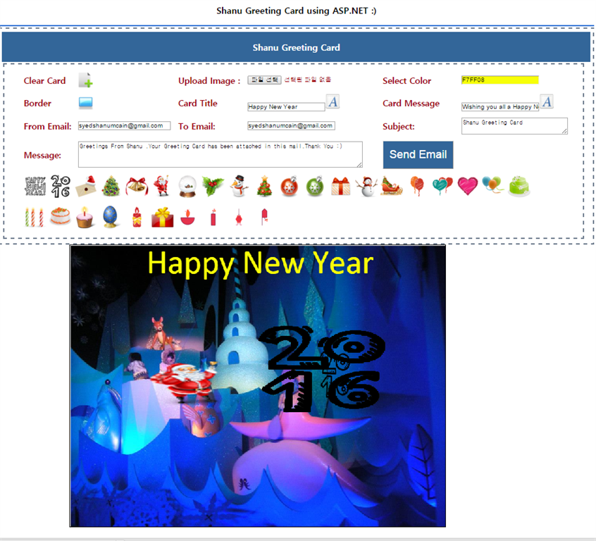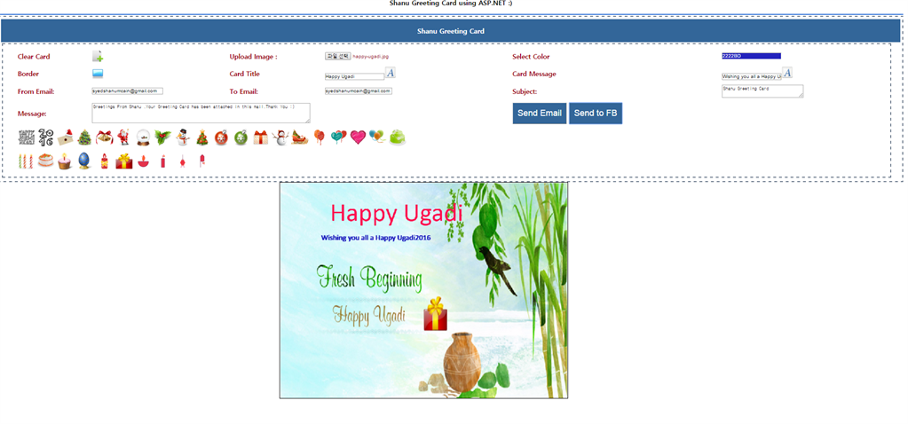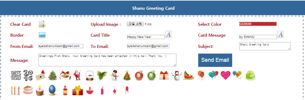 - Save and Send to Email: The final created Greeting Card can be saved to the application root folder. Also, send the card to a user entered email address.