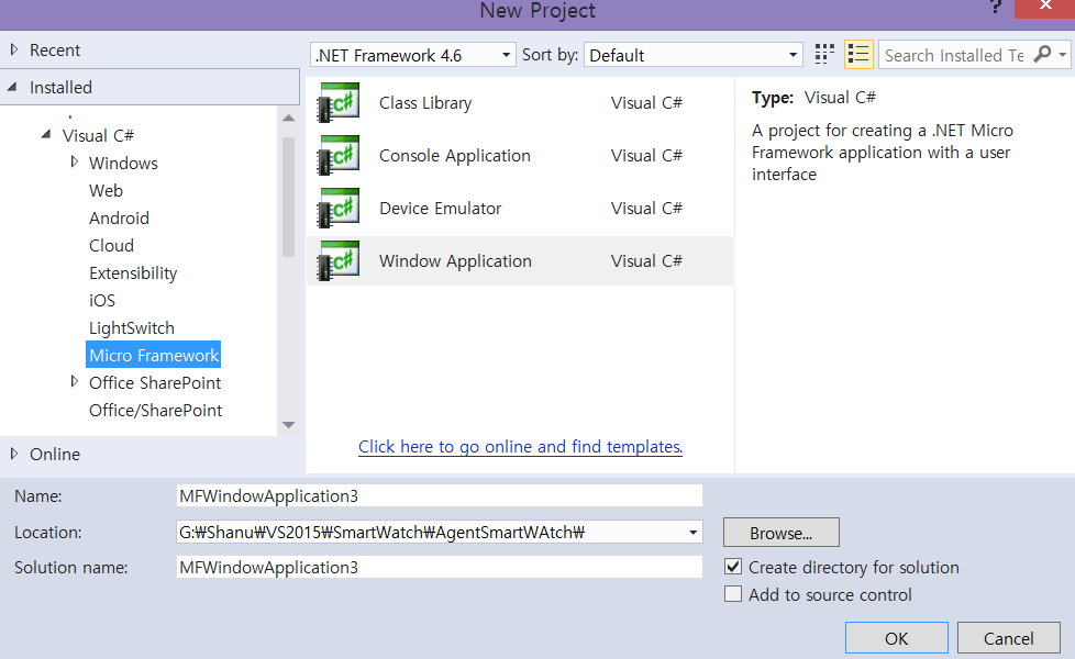 Click New, Project, select Micro Framework from template and click Windows Application. Select your project folder and give proper name for your project. After that click Ok