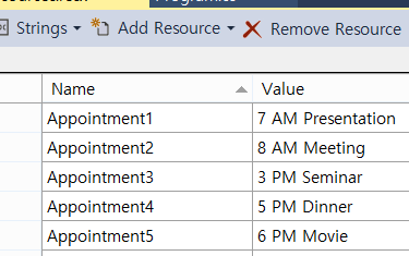 In this method I will be displaying today's Appointment for the user. Firstly, I will add today's plan list in the Resource string like the following screenshot: