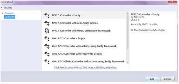 Right-click Controllers then select Add Controller then select MVC 5 Controller–Empty then click Add.