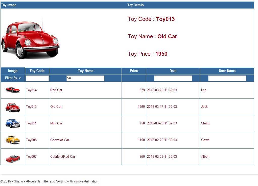 Since this article explains how to use Filter, Sort and Simple Animation in AngularJS let's see one by one here.