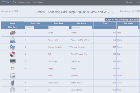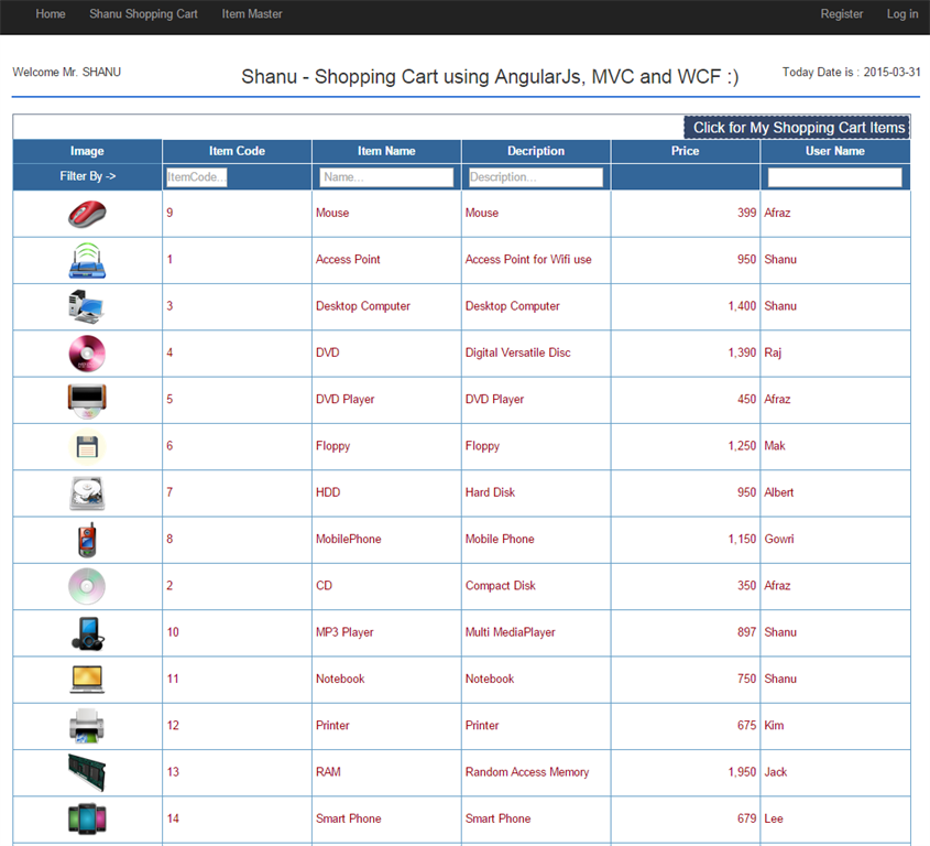 Shanu Shopping Cart Menu: By default I will display all the item details. The user can filter by Item Code, Item Name and Description and by User Name to search their Item from the list. The user can also sort items by clicking on the Column Header.