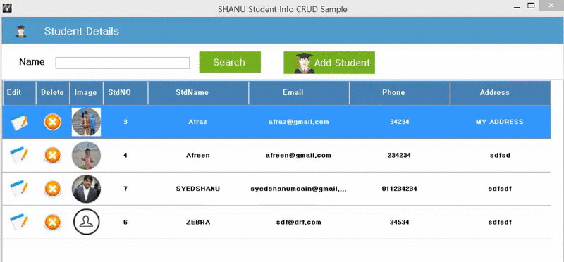 - In this sample demo we will learn in detail how to perform CRUD operation for Student Profile Management using DatGridView WinForms.
