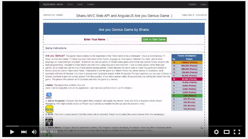This game I have created by the inspiration of the “Who Wants to Be a Millionaire”. It is a world famous TV Show. In India, similar TV Show has been telecasted in Tamil Language as “Neengalum Vellalam Oru Kodi “ and in Hindi language as “Kaun Banega Crorepati”. On the Internet we can see plenty of similar online games and mobile app games mostly created with flash programming. I thought to make things simpler by creating one with MVC using AngularJS and WEB API. I love to make games rather than play games. So to make new games now I have started playing games. I have followed the same rules to make this game and instead of Money ($) I have used Points and named my game as “