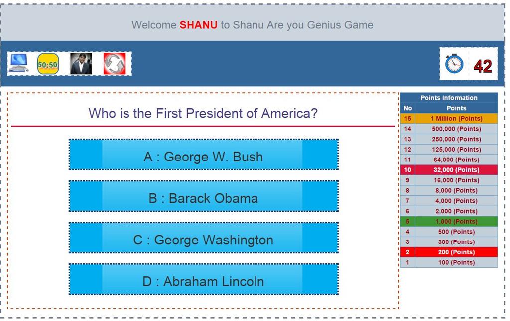 In each 5th question the player will reach the Safe Zone. Here in points we can see in each 5th question I have marked different color. Now for example let’s consider a player is playing this game and he/she answered 5 questions correctly and in 6th question if he picks the wrong answer then he will be getting total 1000 Points. If the player plays a game and he/she answers 3 questions correctly and for the 4th question if he picks the wrong answer then he will get 0 points no matter he answered 3 questions correctly. The player has to pick the correct answer. If he/she picks the wrong answer then he will be getting his last safe zone points. For example, a player answers 12 questions correctly and in 13th question if he picks the wrong answer then he will be getting 32,000 instead of 125,000 Points of 12th question. If the player answers all the 15 questions correctly then he’s the winner and will be a genius.