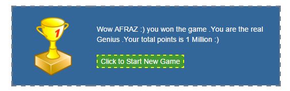 Genius: If the player answered all the 15 questions, then he will be considered as Genius. Here we can see that I have answered all the 15 questions and won 1 Million Points.