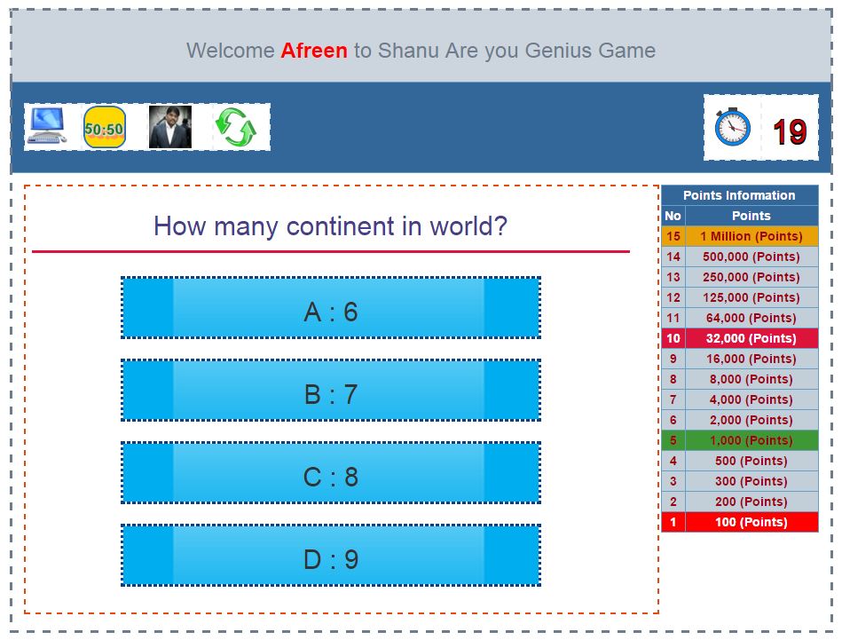 Ask to Shanu: This is similar to Ask to computer Lifeline. If user don’t know the current question user can Ask to Shanu for displaying the Answer. Note the Answer has 90% chances of being correct, so the player has to decide whether to pick that SHANU presented an answer or not. This Lifeline can be used only one time per game for a player. Here we can see for the following question I don’t know the answer, so I have clickednAsk to Shanu lifeline. Once I clicked on that the Ask to computer image will be changed to disabled image. User can click and use only one time so think before using this option.