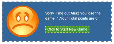 When the counter value is 0, then I will stop the timer and display the alert message as you lose the game and display the players last points value. Here we can see the points as 0 since in my first question I didn’t answered the question within 45 seconds.