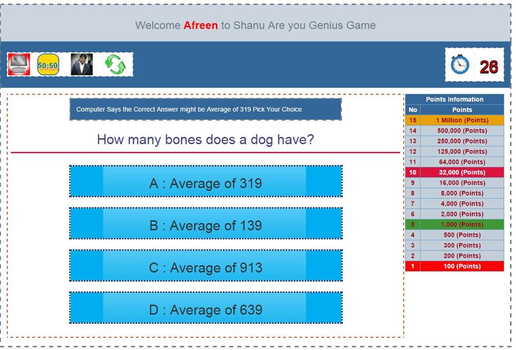 Ask to Computer: If user don’t know the current question iser can ask the computer to display the Answer. Note the Answer has 90% of chances to be correct, so the player has to decide whether to pick the computer presented answer or not. This Lifeline can be used only one time per game for a player. Here we can see for the following question I don’t know the answer so I clicked one the Ask to Computer lifeline. Once I clicked on that the Ask to computer image will be changed to disabled image. User can click and use only one time, so think before using this option.