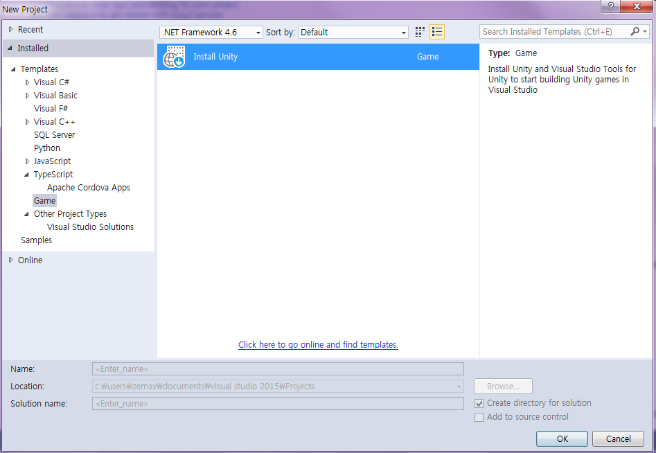 Click New, then Project and select Game. If you didn't installed Unity in your computer you can install from here. Select Install Unity and click OK.