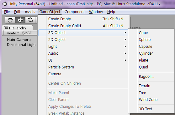 When we care our Unity program in the Hierarchy window we can see by default the Main Camera and Directional Light will be added.