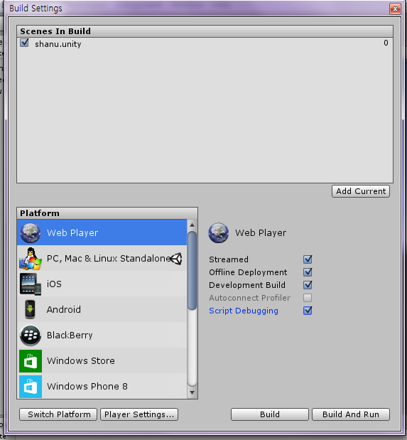 Select your Scene. Since we created only one Scene, I will click on the Add Current button that will add our Current Scene to be built and run. In the platform we can see Web Player, PC, iOS, Android and so on. We can select any one to see our output in our selected platform. Here I have selected the Web Player.